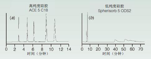除了峰形得到改善之外,由于這些不可預(yù)測(cè)的次級(jí)硅烷醇相互作用的減少,高純度硅膠比低純度硅膠具有更好的再現(xiàn)性。