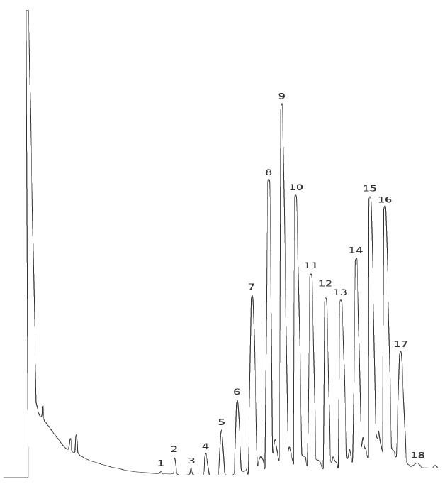 樣品:1.T24   2. 膽 固 醇  3.T26  4.T28   5. T30 6.T32    7.T34     8. T36     9. T38     10.T40 11.T42    12. T44     13. T46    14. T48   15.T50     16. T52     17. T54    18.T56(T= 總碳數(shù))