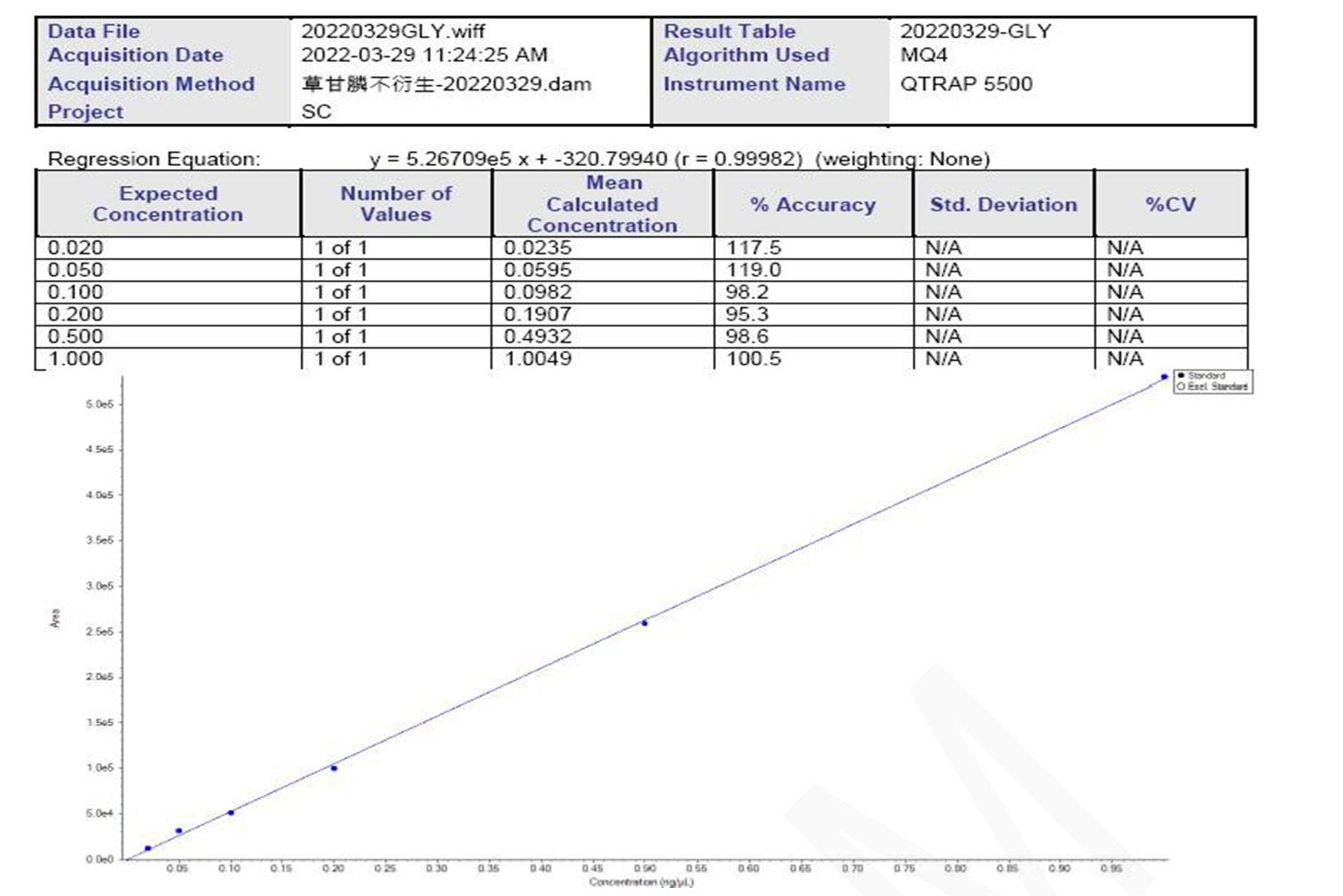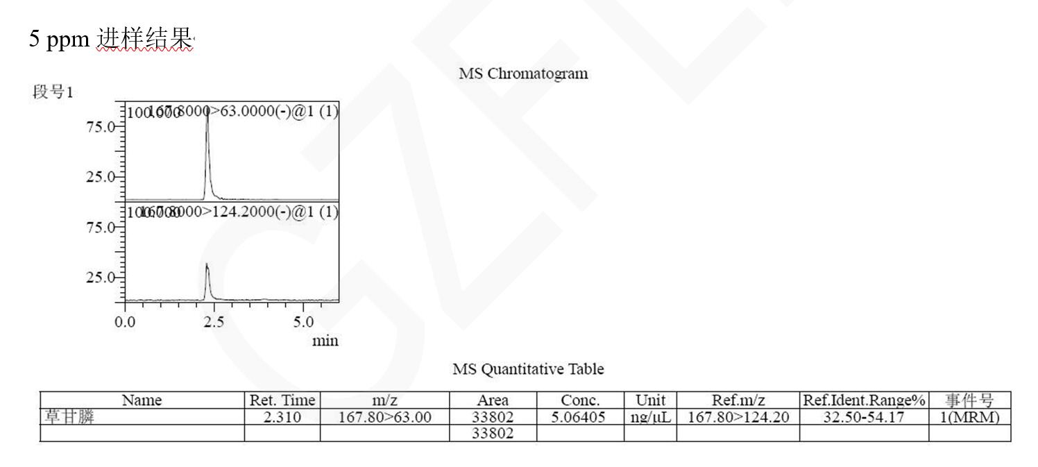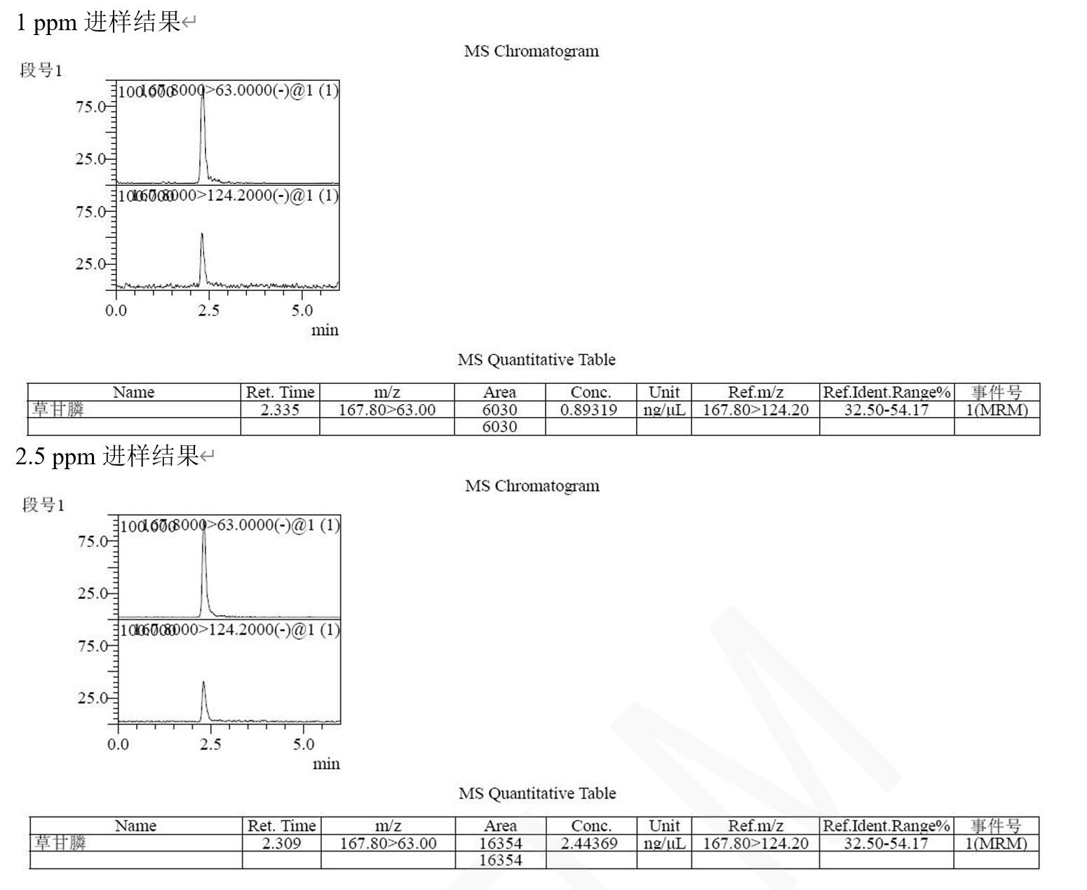 說(shuō)明:本方法研究草甘膦不衍生直接檢測(cè)。相比于傳統(tǒng)衍生后用 C18 分析,或者用氨基柱不衍生 PH=10-11 條件下分析,帶來(lái)的復(fù)雜,耗時(shí),以及氨基柱結(jié)果重現(xiàn)與壽命上的問(wèn)題。此方法簡(jiǎn)單,快速,方便。可滿(mǎn)足常規(guī)分析檢測(cè)需求以及多數(shù)殘留檢測(cè)需求。