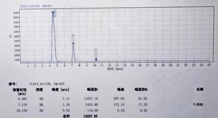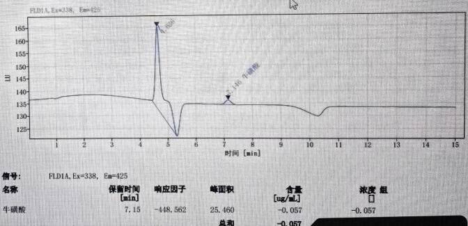 App ID: FLM-M240001 GB 5009.169-2016 食品中牛磺酸的測(cè)定 色譜柱:MARS MNa 5u,250*4.6mm(貨號(hào):FMG-1036-EONU) 流動(dòng)相:檸檬酸三鈉溶液(稱取19.6g 檸檬酸三鈉,加950mL 水溶解,加入1mL 苯酚,用硝酸調(diào)pH 至3.10-3.25, 經(jīng) 0.45um 微孔濾膜過濾。 流速:0.4mL/min 熒光衍生溶劑流速:0.3mL/min 檢測(cè)波長(zhǎng):激發(fā)波長(zhǎng):338nm, 發(fā)射波長(zhǎng):425nm 柱溫:55℃ 柱后衍生系統(tǒng):SSI Allchrom PCR6000 柱后衍生系統(tǒng) 檢測(cè)器:熒光檢測(cè)器進(jìn)樣量:20ul 樣品: