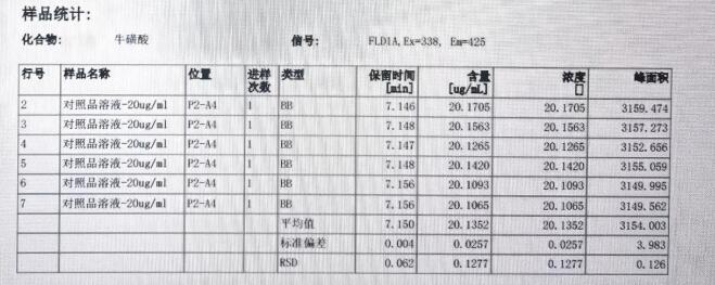 用牛磺酸標(biāo)樣做重現(xiàn)性實(shí)驗(yàn),用 20ug/mL 濃度的標(biāo)樣 6 針,其保留時(shí)間的相對(duì)標(biāo)準(zhǔn)偏差(RSD)是 0.062%, 峰面積的相對(duì)標(biāo)準(zhǔn)偏差(RSD)是 0.126%。