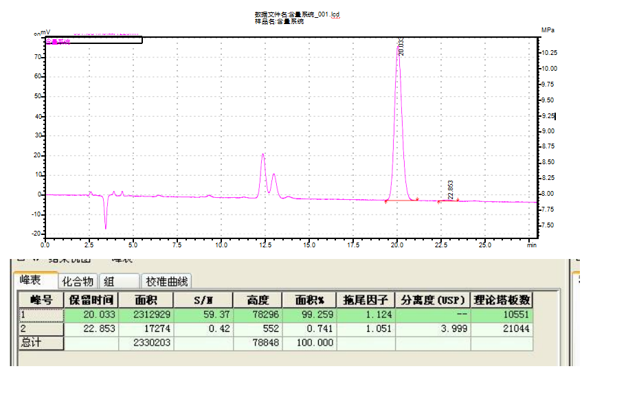 評價:要求與相鄰酸性降解產(chǎn)物峰的分離度應(yīng)不小于 2.0;理論板數(shù)按莫匹羅星峰計算不低于 1500,拖尾因子不大于 2.0。均符合要求,且效果很好。