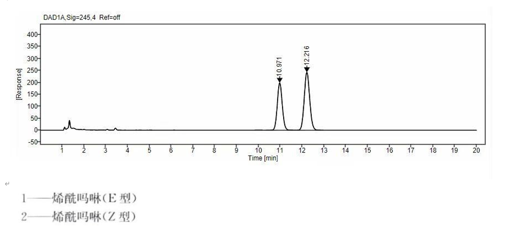 烯酰嗎啉: 流動(dòng)相:乙腈:0.1%磷酸水=40:60 波長(zhǎng):254nm 色譜圖: