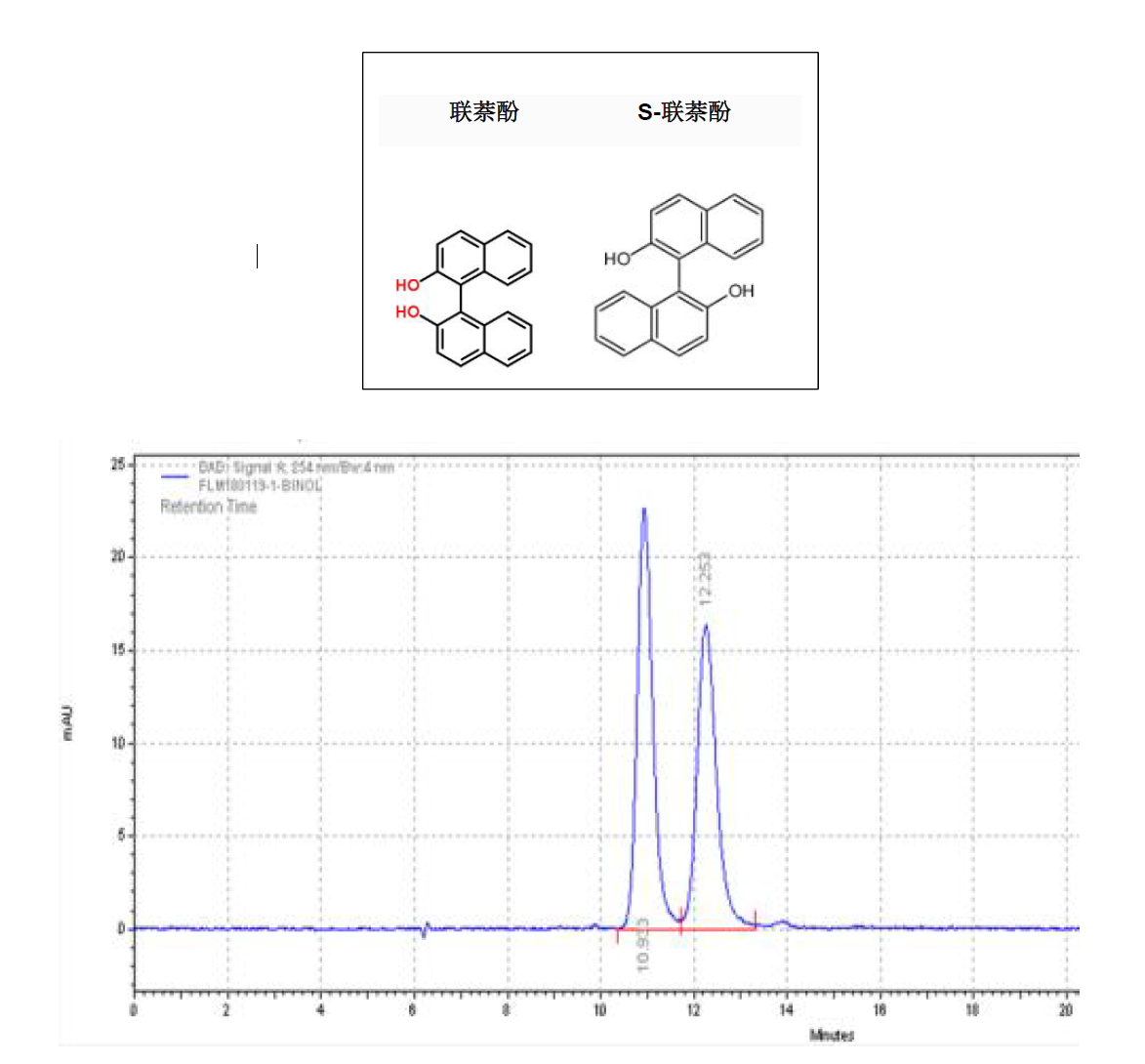 App ID: FLM-B250006 聯(lián)萘酚與S-聯(lián)萘酚的分離 色譜柱:Chiral INC 250*4.6mm,5um (貨號:FMG-JY5-I03) 流速:0.5 mL/min 檢測:波長254nm, 柱溫:25°C 樣品濃度:N/A 進樣量:1μ 溶劑:水:甲醇=40:60(V:V) 流動相:咨詢銷售